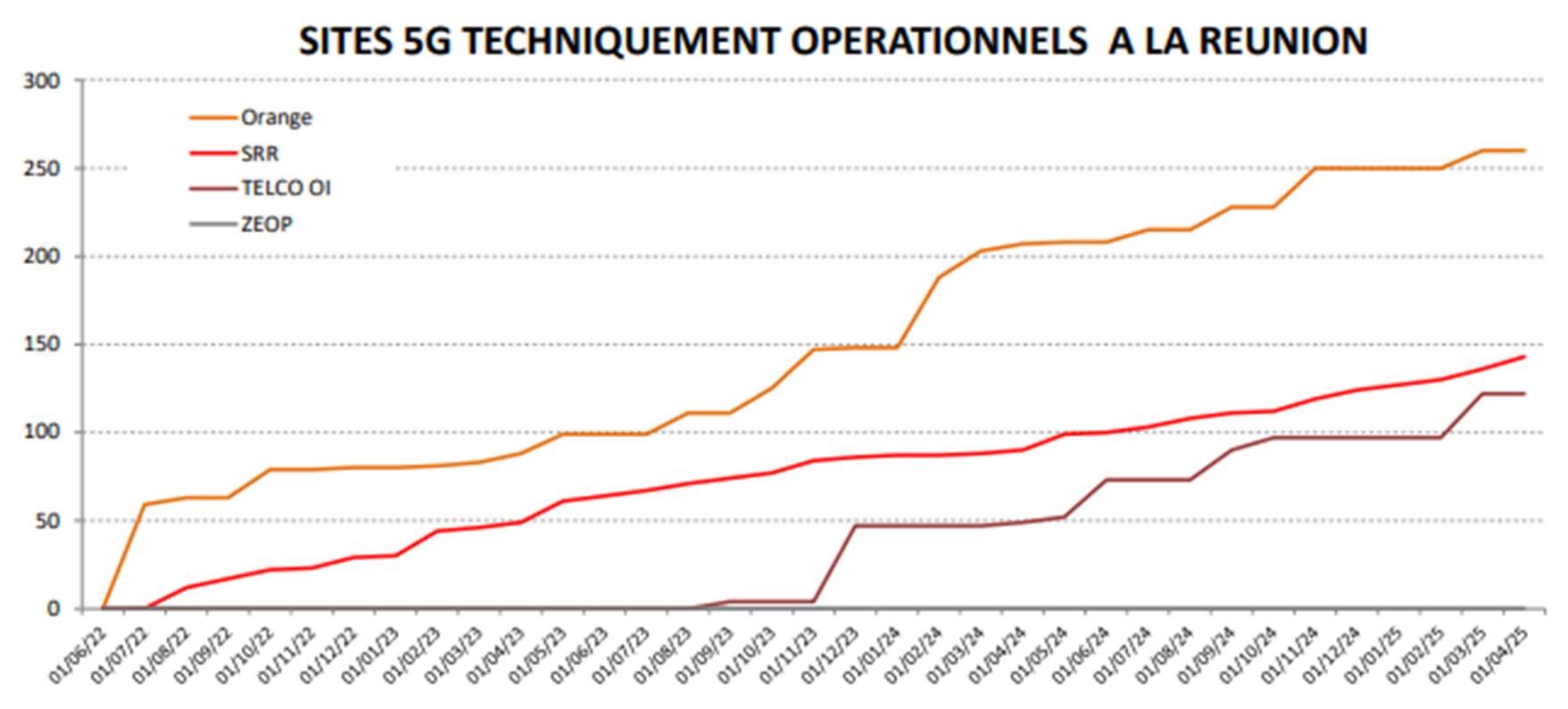Le dernier baromètre mensuel de l’observatoire du déploiement des réseaux mobiles Outre-Mer publié par l’ANFR - Agence Nationale des Fréquences - place nettement Orange en première position du nombre de sites 5G techniquement opérationnels à La Réunion. Avec près d’une centaine de sites 5G de plus que ses concurrents au 31 mars 2025, Orange continue sa progression et compte à ce jour 260 sites 5G opérationnels.