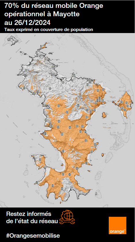 Les équipes techniques d’Orange sont pleinement mobilisées pour rétablir le réseau mobile à travers l’archipel. Aujourd’hui, environ 70% de la population est partiellement à totalement couverte dans les zones suivantes :