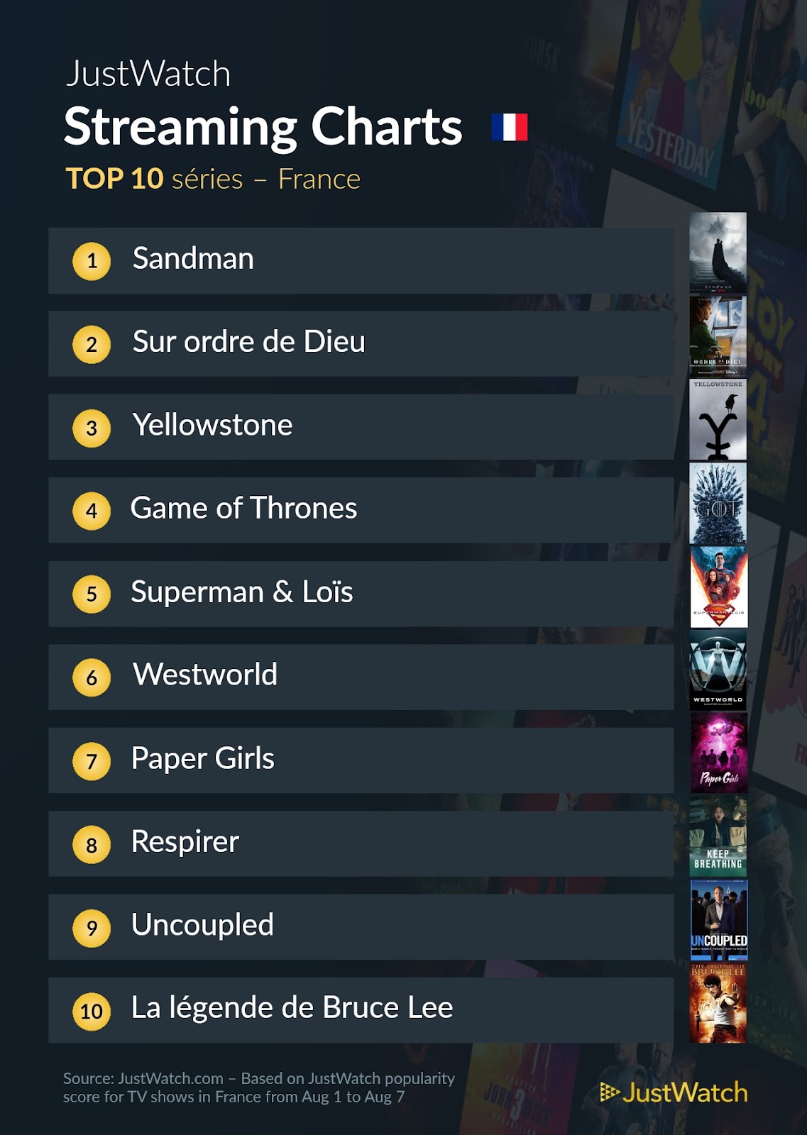 Le site partenaire JustWatch a répertorié les contenus les plus regardés en France sur les différentes plateformes de streaming (Netflix, myCANAL, Prime Video...) du 1er au 7 août.