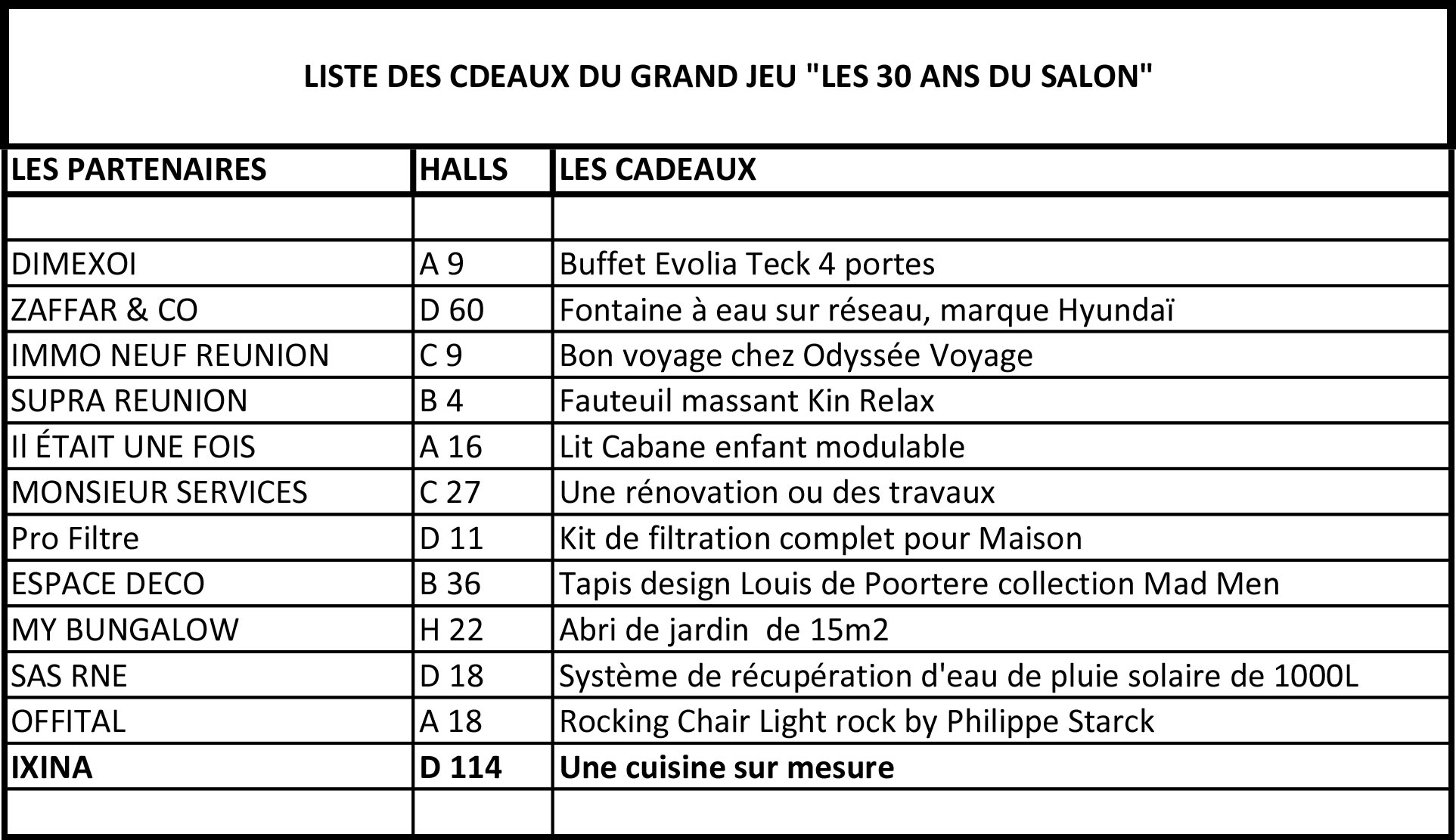 Le Grand jeu des 30 ans :Un super cadeau : une cuisine sur mesure d’une valeur de 12 000,00 € est à gagner par tirage au sort le vendredi 8 mai.Chaque jour, un gros lot offert par nos partenaires est à gagner par tirage au sort également.