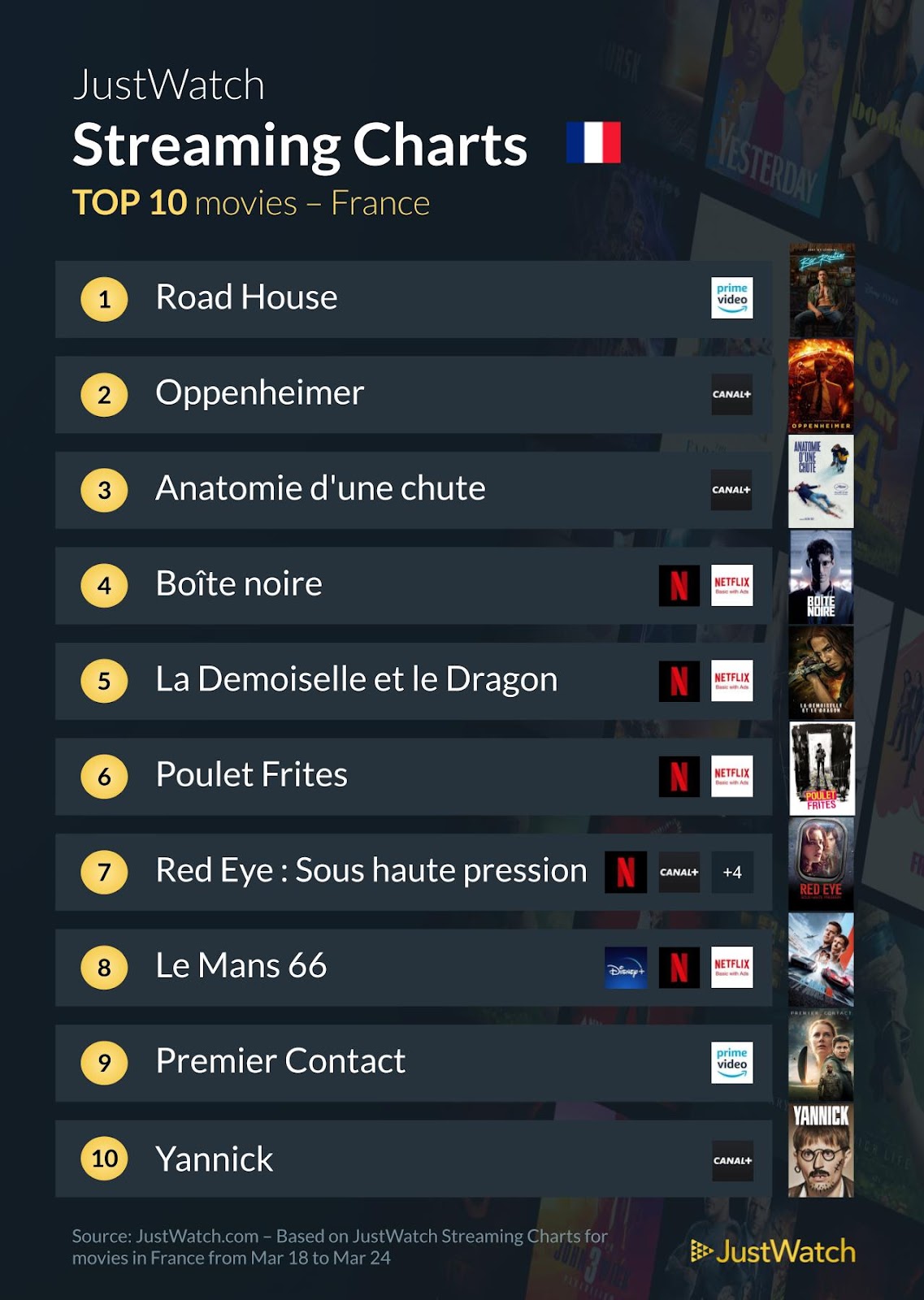 Le site partenaire JustWatch a répertorié les contenus les plus regardés en France sur les différentes plateformes de streaming (Netflix, myCANAL, Prime Video...) du 18 au 24 mars.