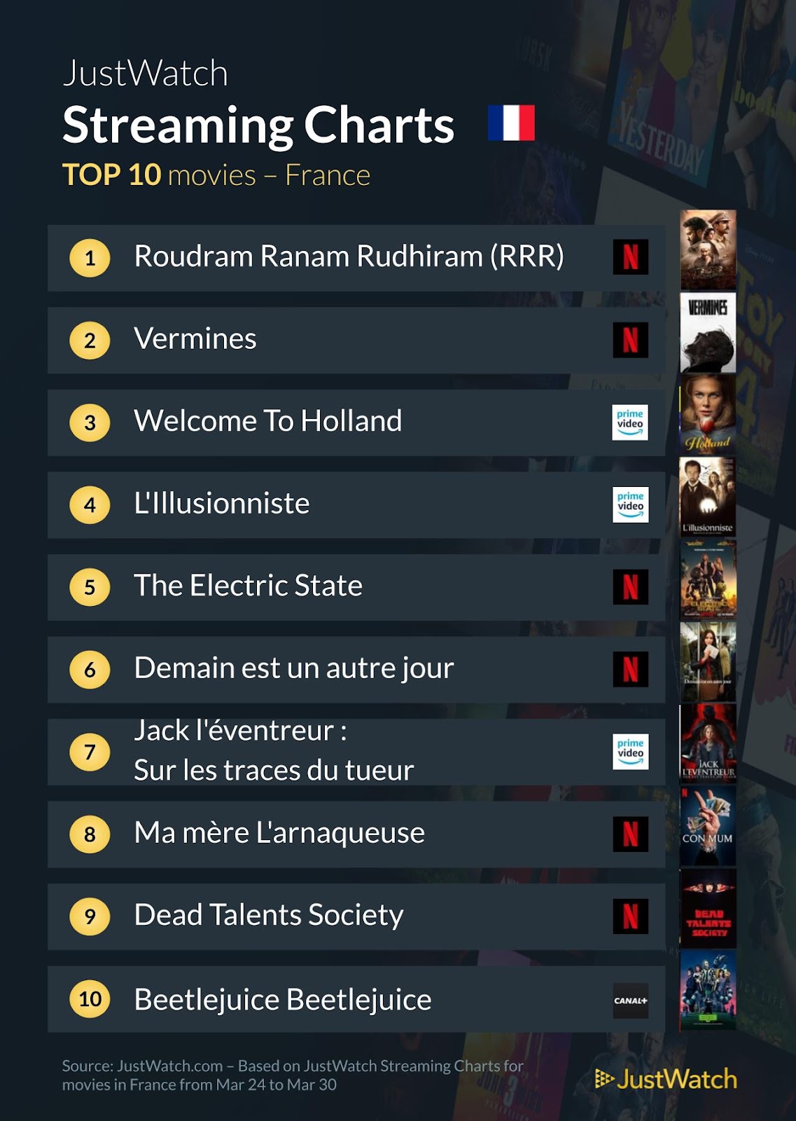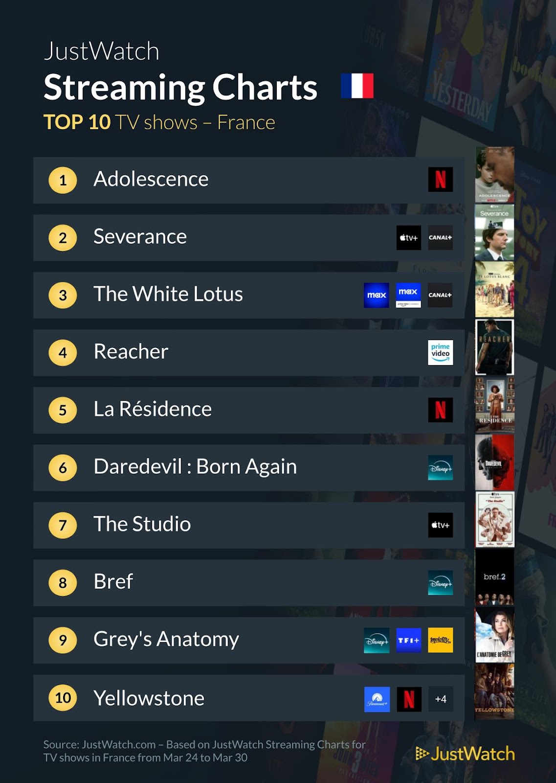 Le site partenaire JustWatch a répertorié les contenus les plus populaires en France sur les différentes plateformes de streaming (Netflix, myCANAL, Prime Video...) du 24 au 30 mars 2025.