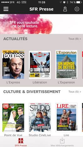 Suite à la signature d'un accord avec Toutabo SA (exploitant du kiosque numérique ePresse), SFR PRESSE enrichit significativement son catalogue, déjà fort des 17 titres d'Altice Media Group (dont Libération, L'Express, l'Expansion, 01Net, L'Etudiant, Point de Vue, Lire, Studio Ciné Live.) en le complétant par des titres phares de la presse quotidienne nationale et régionale (Le Parisien, Aujourd'hui en France, Midi Libre, La Montagne, Le Télégramme.)
