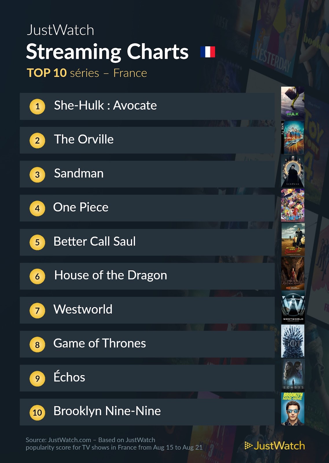 Au niveau des séries, on retrouve à la première place SHE HULK : AVOCATE , une série Disney+ suivi de The Orville, trouvable sur la plateforme à Mickey et enfin à la troisième place on retrouve Sandman, une série accessible sur Netflix