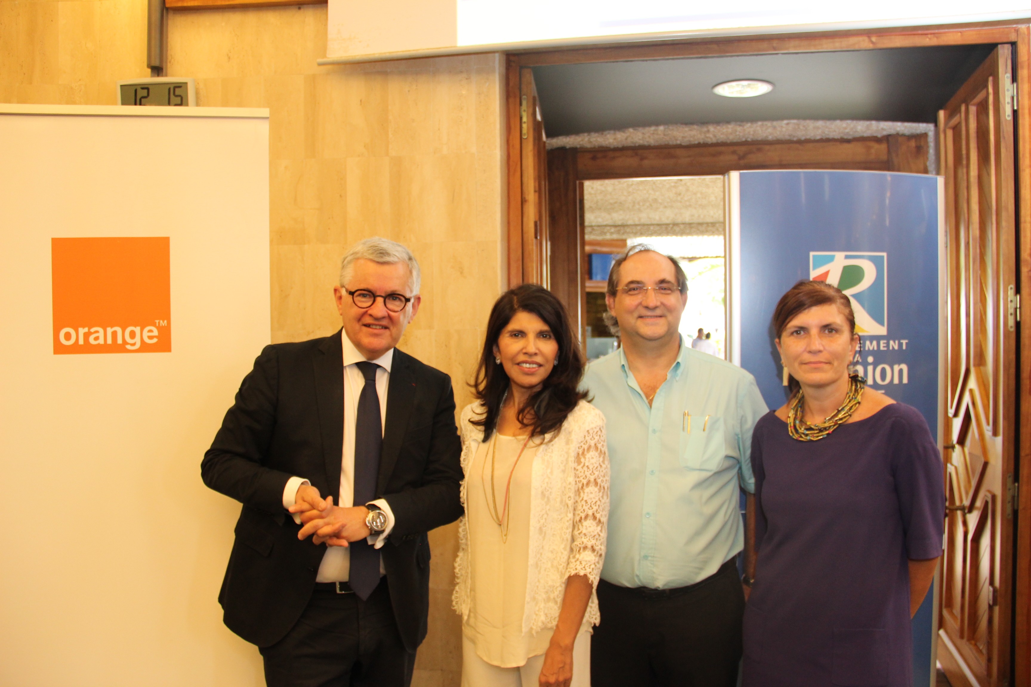 Nassimah DINDAR, Présidente de l’Assemblée Départementale, Jean-Claude Lacouture, Membre de l’Association des Maires de La Réunion représentant le Président Stéphane Fouassin, Bruno JANET, Conseiller du Président de la société Orange et Mireille HELOU directrice Orange Réunion Mayotte cosignent ce mercredi 30 mars une charte « Qualité Réseau » ayant pour principaux objectifs de renforcer le dialogue avec les collectivités locales et à améliorer l’efficacité des interventions sur le réseau.