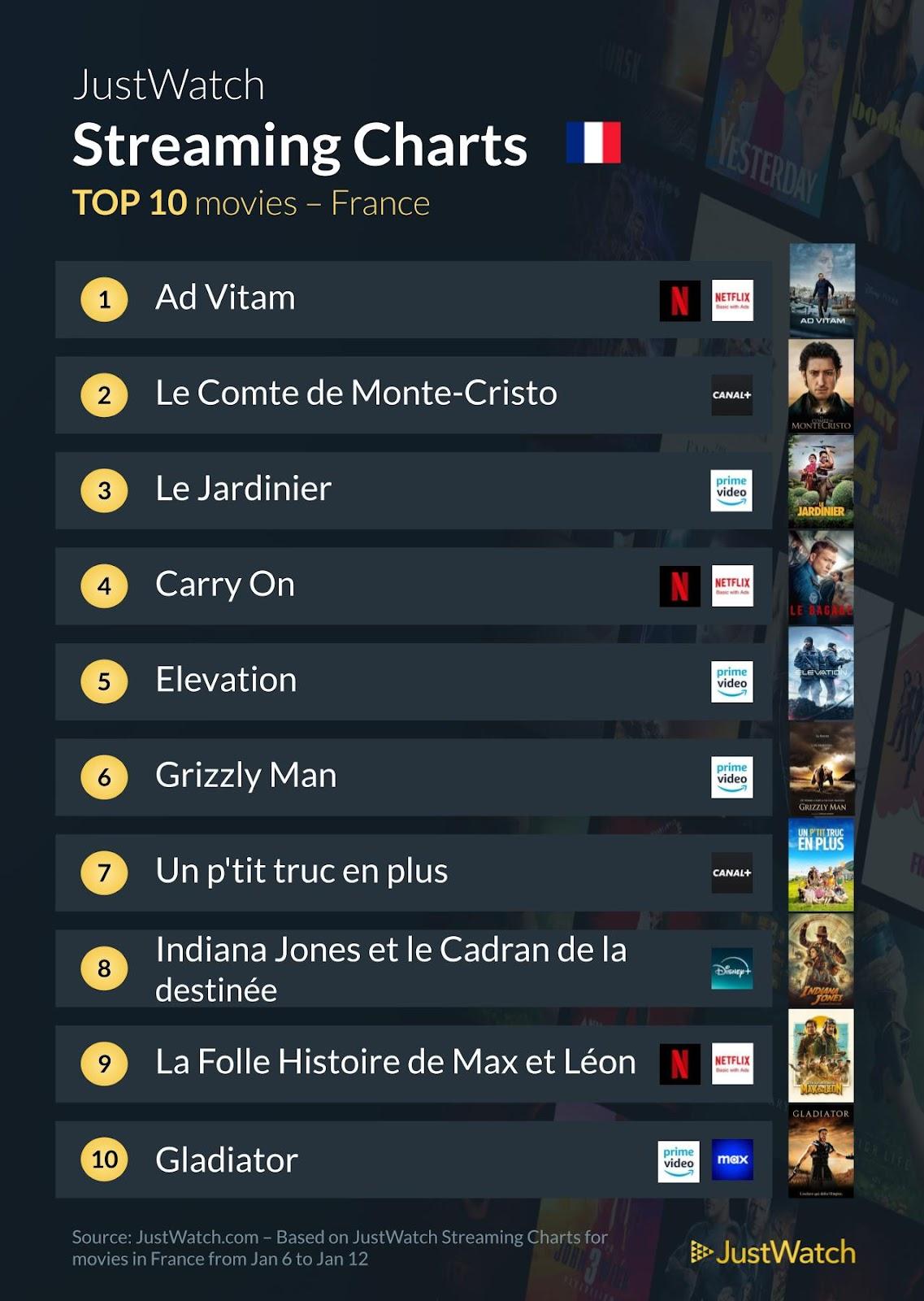Le site partenaire JustWatch a répertorié les contenus les plus populaires en France sur les différentes plateformes de streaming (Netflix, myCANAL, Prime Video...) du 6 au 12 janvier 2025.