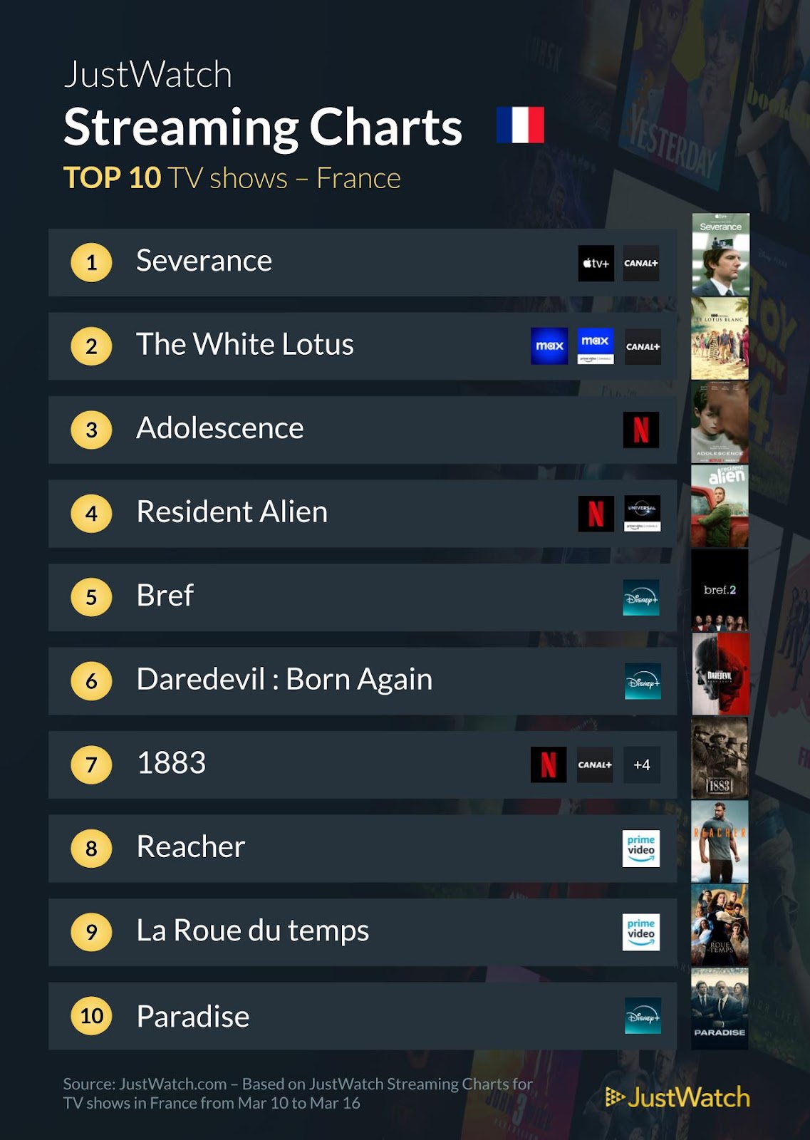 Le site partenaire JustWatch a répertorié les contenus les plus populaires en France sur les différentes plateformes de streaming (Netflix, myCANAL, Prime Video...) du 10 au 16 mars 2025.