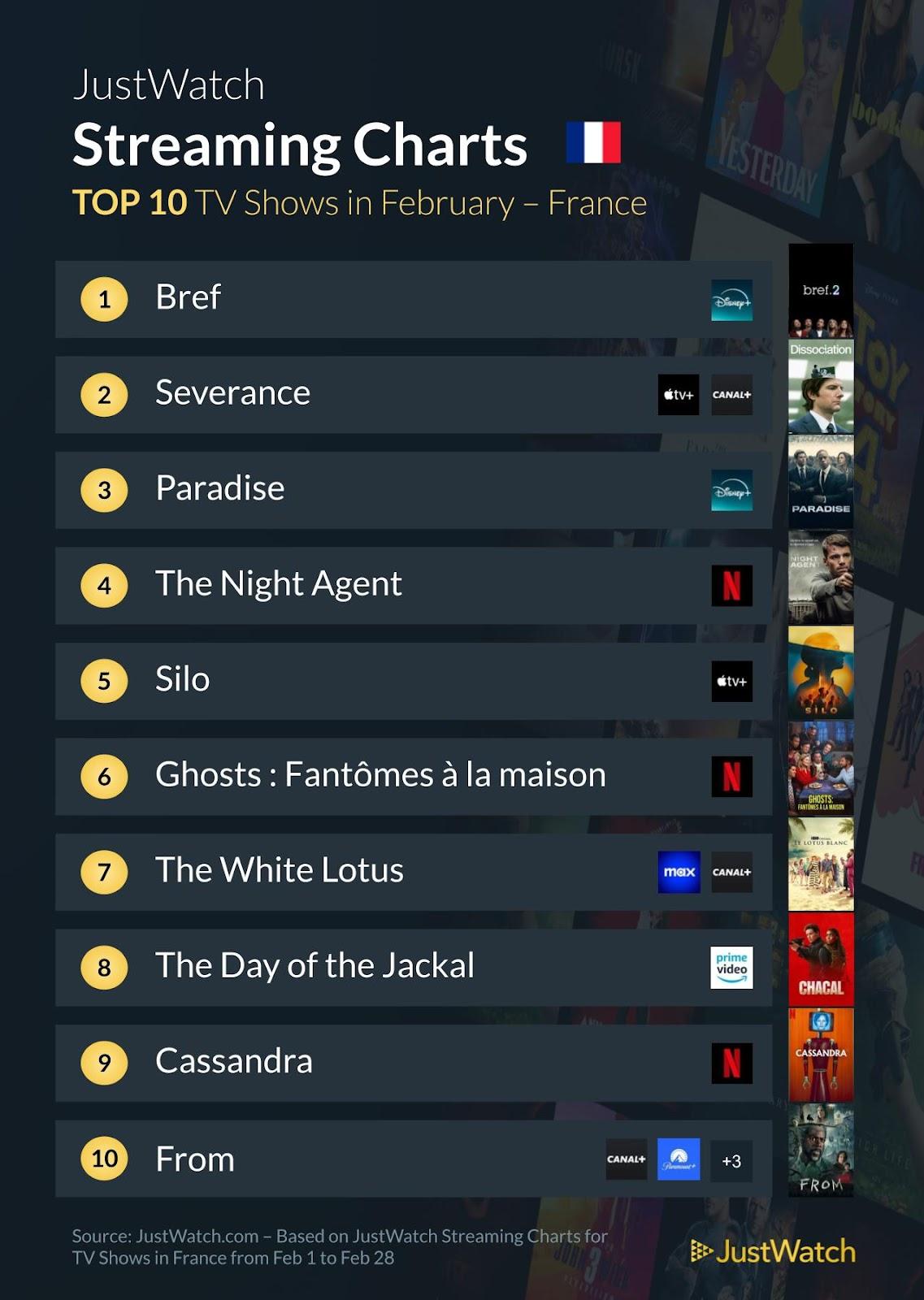 Du côté des séries, en février 2025, "Bref" s’impose en tête du classement, suivi de "Severance", qui gagne du terrain, et de "Paradise", nouvelle entrée remarquée.