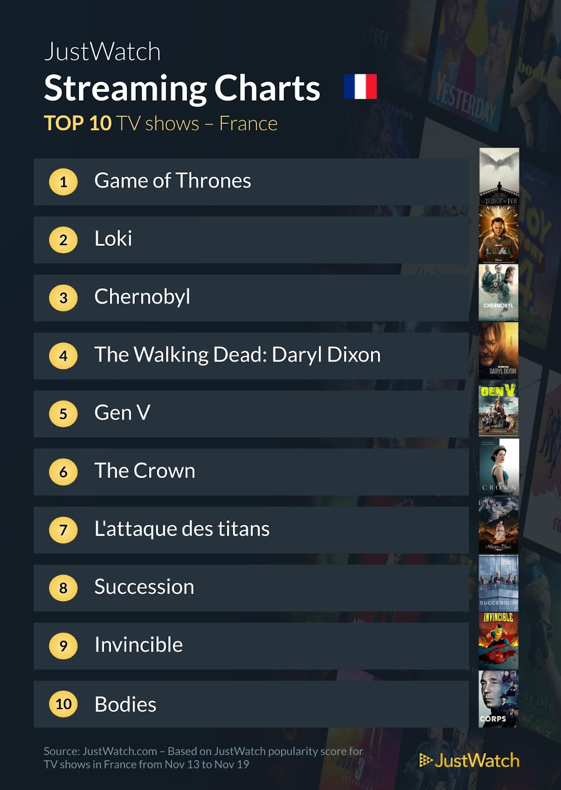 Le site partenaire JustWatch a répertorié les contenus les plus regardés en France sur les différentes plateformes de streaming (Netflix, myCANAL, Prime Video...) du 13 au 19 novembre.