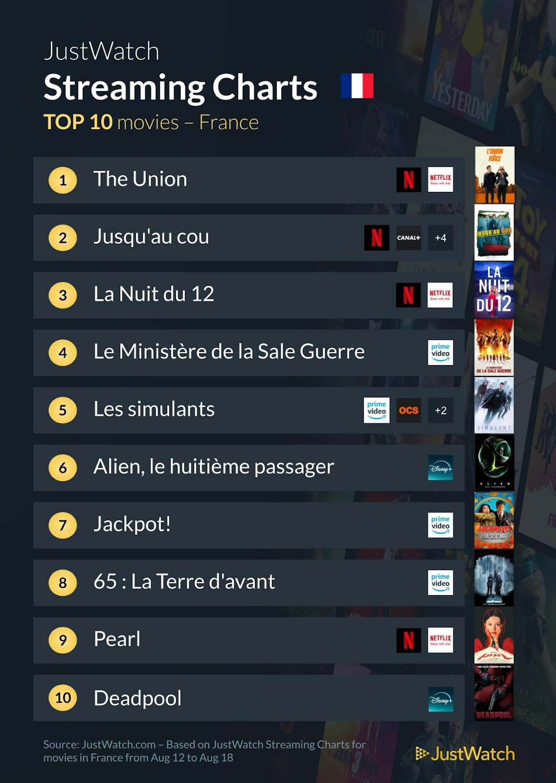 Le site partenaire JustWatch a répertorié les contenus les plus populaires en France sur les différentes plateformes de streaming (Netflix, myCANAL, Prime Video...) du 12 au 18 août 2024.