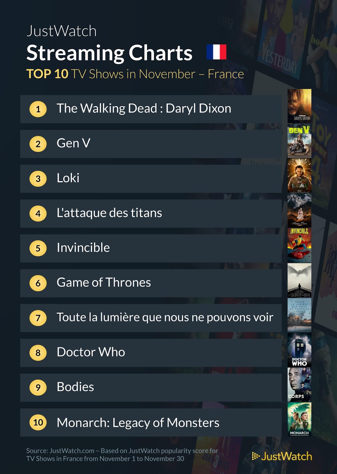Au niveau des séries, on retrouve ainsi à la première place "The Walking Dead : Daryl Dixon", la série évènement de Paramount+ avec Norman Reedus suivi de "Gen V" disponible sur Prime Video et enfin à la troisième place on retrouve "Loki", une série disponible sur Disney+.