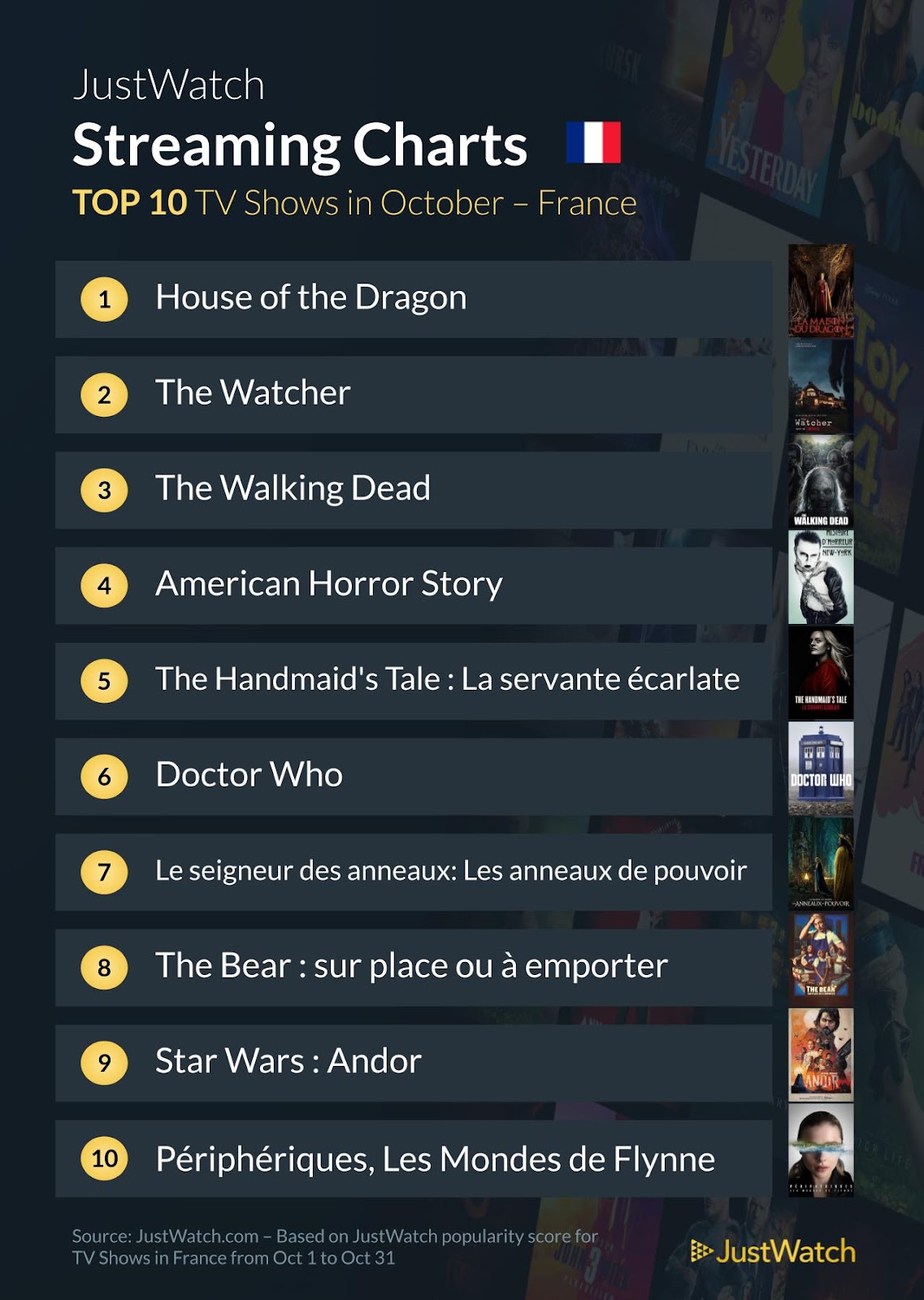 Le site partenaire JustWatch a répertorié les contenus les plus regardés en France sur les différentes plateformes de streaming (Netflix, myCANAL, Prime Video...) en octobre.