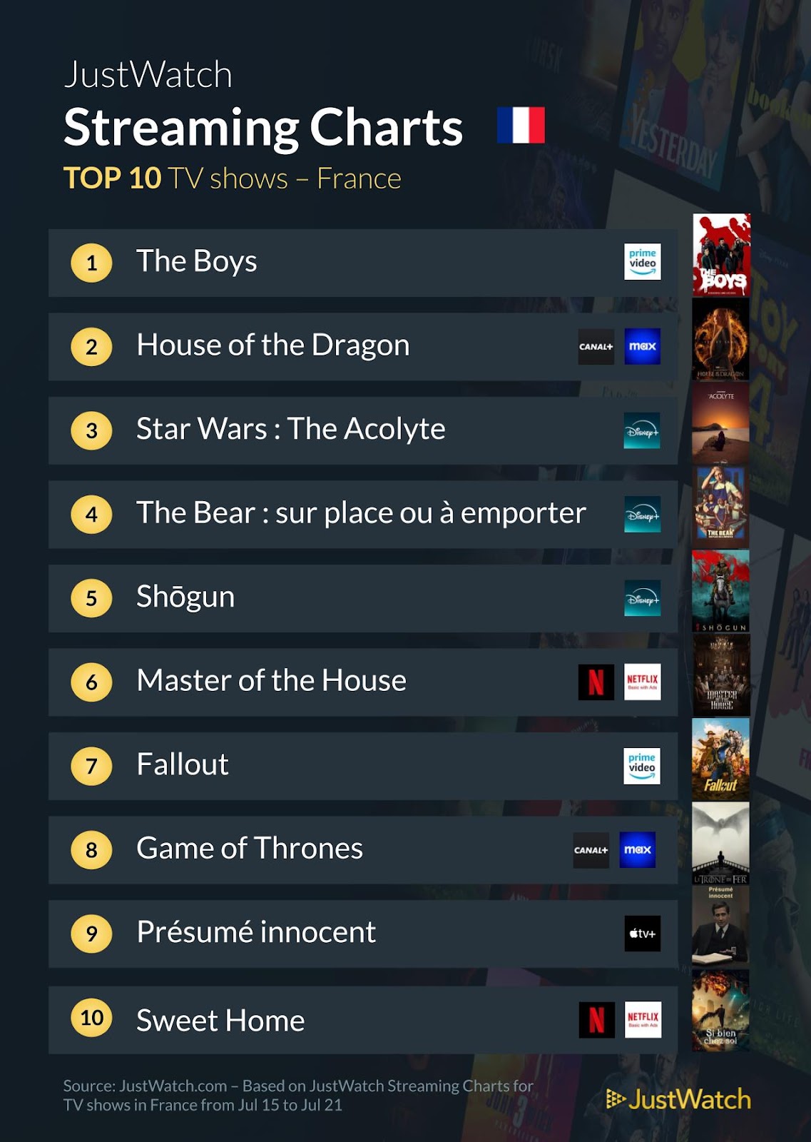 Le site partenaire JustWatch a répertorié les contenus les plus populaires en France sur les différentes plateformes de streaming (Netflix, myCANAL, Prime Video...) du 15 au 21 juillet 2024.