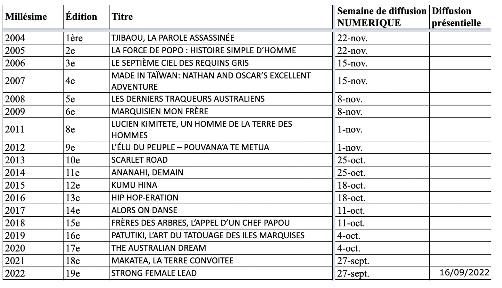 À l’occasion de la 20e édition du Festival en 2023, l’association du Festival International du Film documentaire Océanien est heureuse de dévoiler un programme spécial 20 ans. Chaque semaine, les équipes vous proposent de voir ou revoir 2 films élus prix du public au cours des 20 dernières éditions. Les films seront disponibles en accès gratuits sur le site internet www.fifotahiti.com pendant une semaine selon le programme suivant :