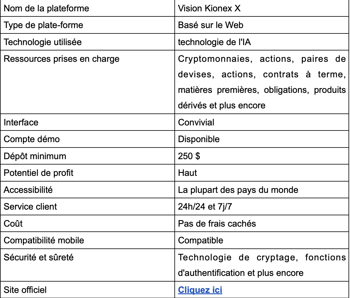 Ces derniers mois, les investisseurs ont plébiscité Vision Kionex X pour ses performances et sa convivialité. Ce système s'est rapidement imposé dans le secteur en pleine expansion du trading automatisé, de plus en plus d'utilisateurs recherchant des alternatives au trading manuel. Il est toutefois crucial d'analyser attentivement ce qui rend Vision Kionex X unique, compte tenu du nombre croissant de plateformes similaires disponibles en ligne. Afin d'aider les lecteurs à déterminer si cette plateforme est rentable, cette analyse examine plus en détail ses fonctionnalités, ses performances et sa fiabilité.